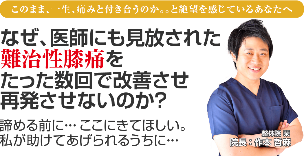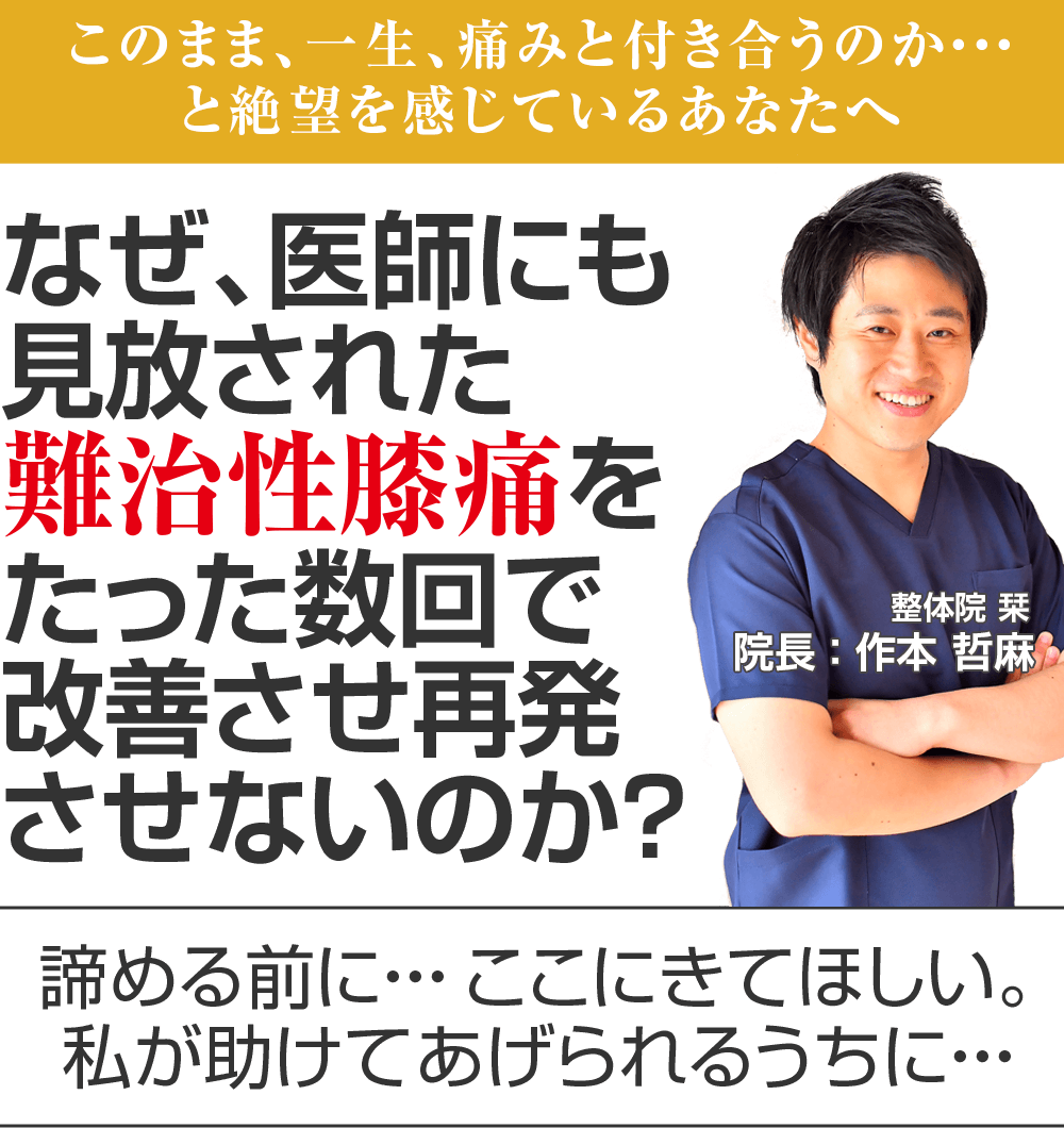 膝痛を改善して仕事や、日常で痛みのない生活を望むなら、一度作本先生の元を訪ねて見てください。