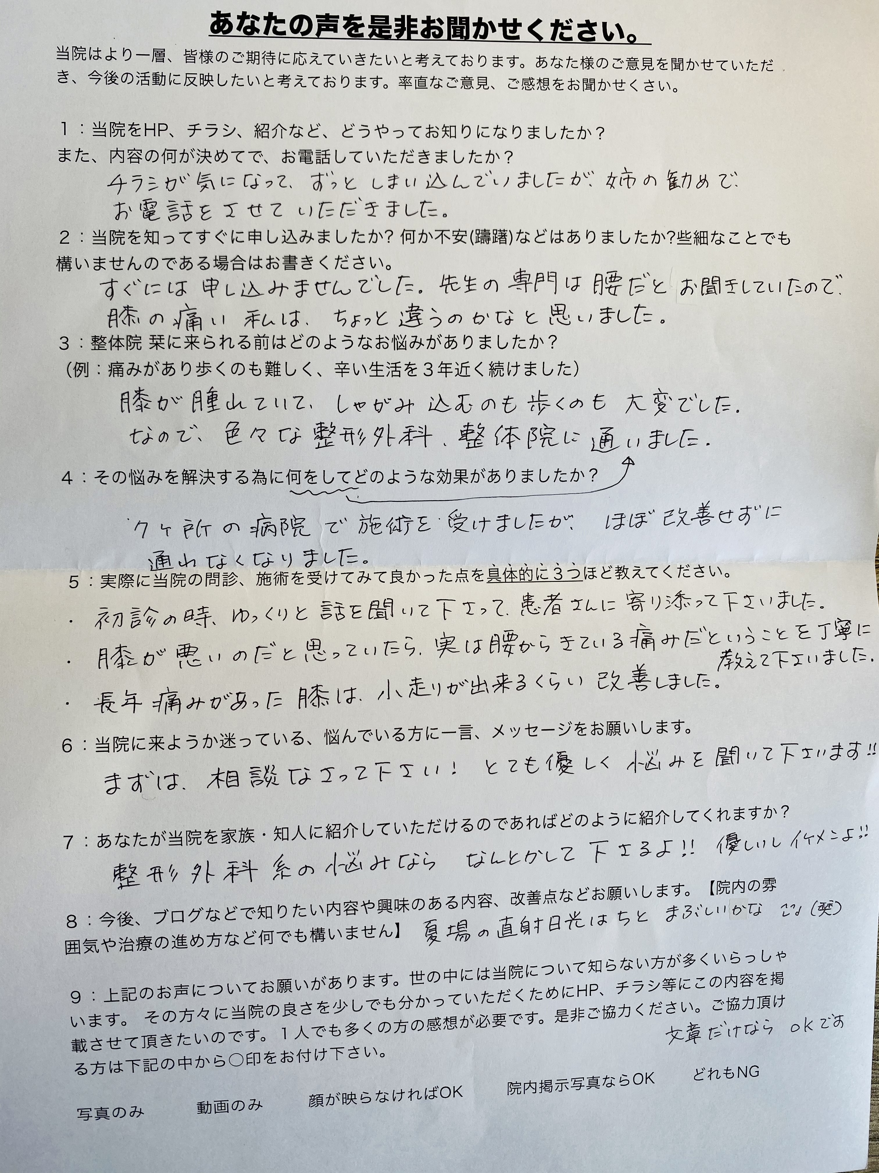 私はあなたの不安をすべて取り除きました。あなたは膝痛のない生活を送れます。まずは自分に許可を出してください。